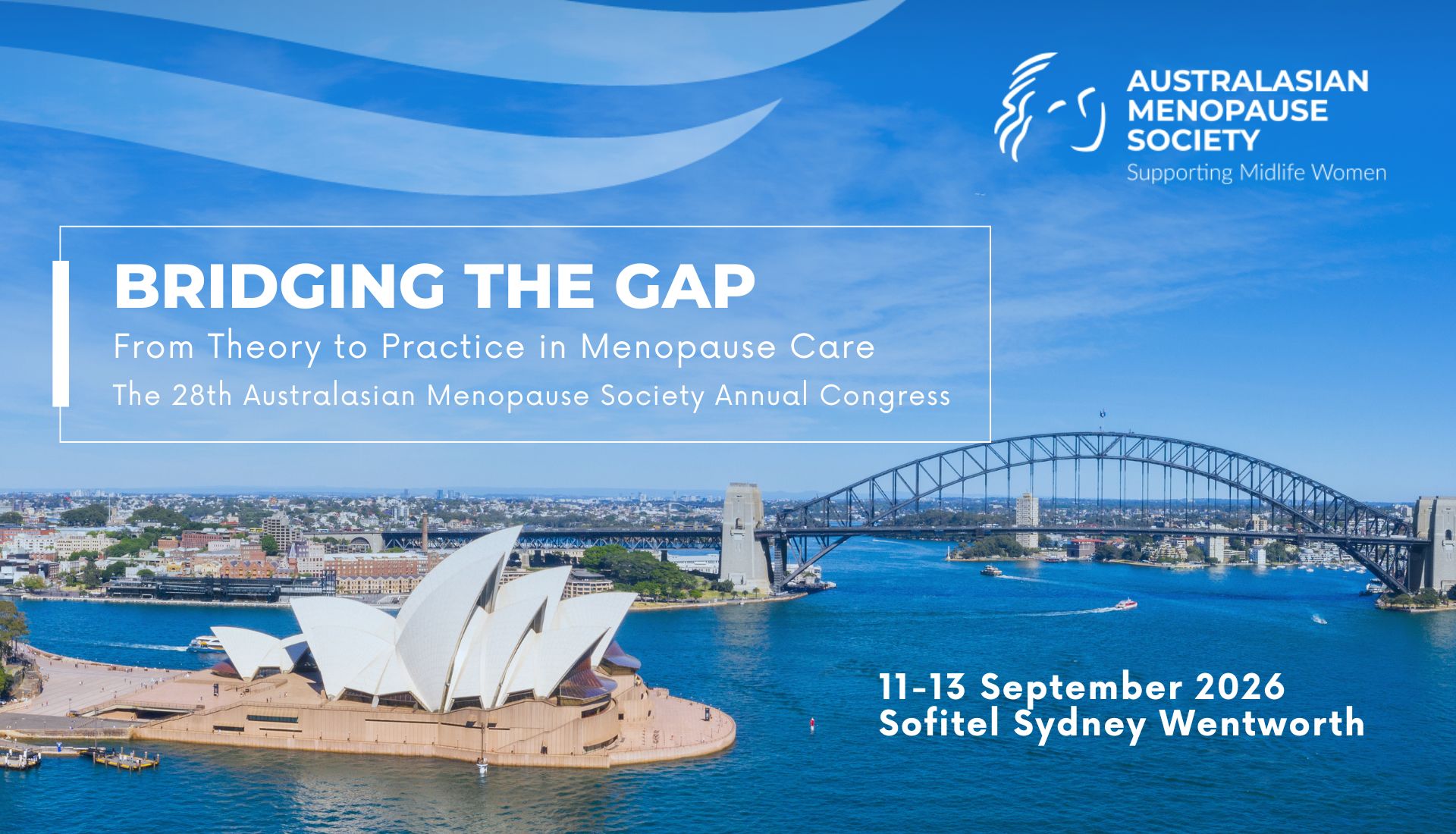 On behalf of the Congress organising committee, I am delighted to invite you to attend the 2026 Australasian Menopause Society Congress, to be held from 11–13 September 2026 at the Sofitel Sydney Wentworth and online.